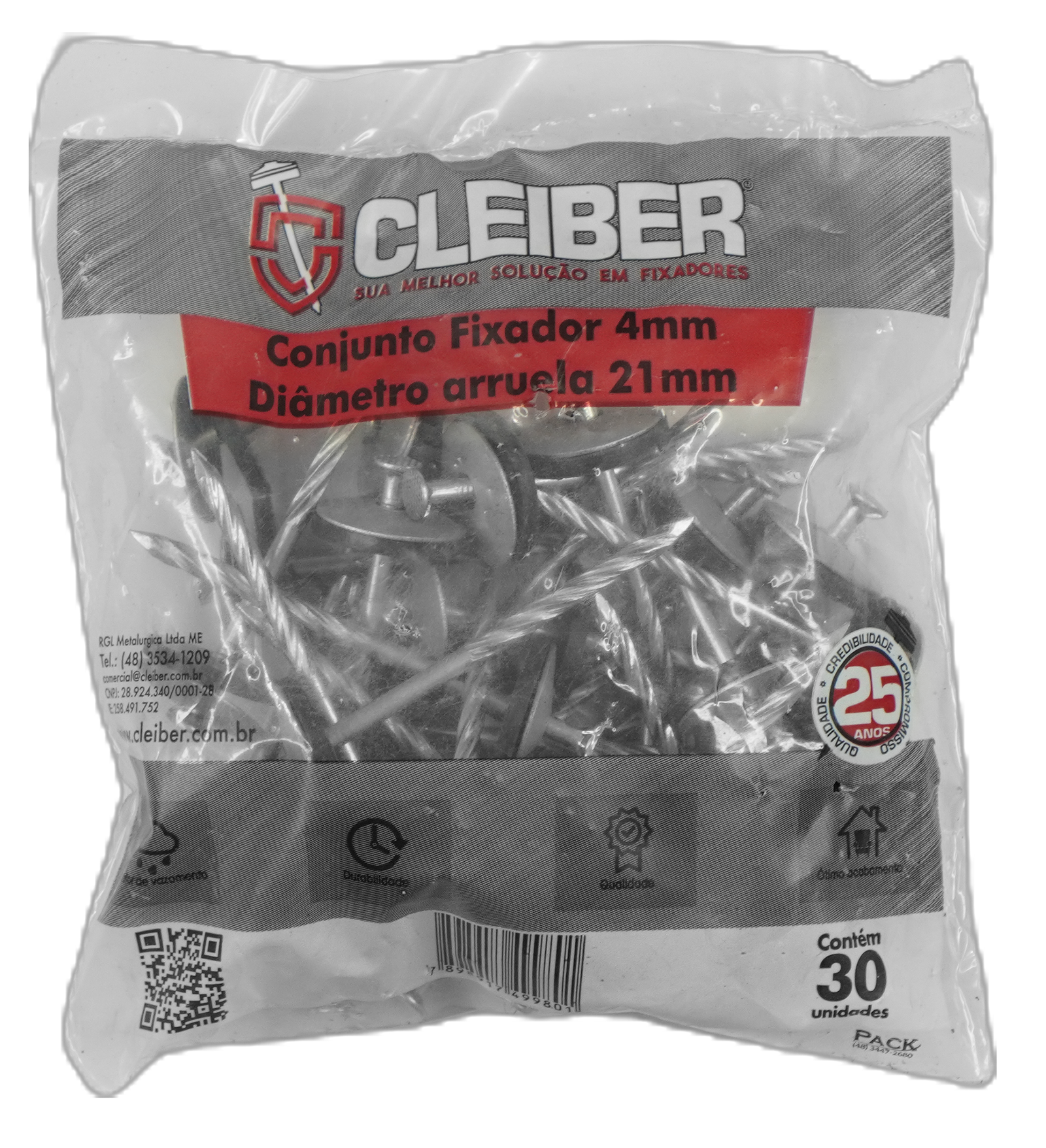 Prego ardox galvanizado eletrolítico com arame SAE1012 com aproximadamente 3,25mm de expessura e aproximadamente 70mm de comprimento. Acompanha arruela de borracha de vedação vulcanizada com 21mm de diâmetro e arruela de chapa galvanizada com 21mm de diâmetro.